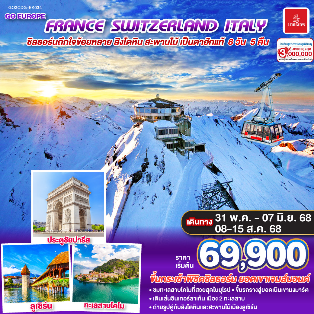 เที่ยวสวิตเซอร์แลนด์ มิลาน - ทะเลสาบโคโม - มหาวิหารดูโอโม่ - เซอร์แมท - นั่งรถไฟสู่ยอดเขากรอนเนอร์แกรต - แทซ- ถ่ายรูปกับปราสาทชิลยอง - เจนีวา - ถ่ายรูปกับนาฬิกาดอกไม้– ถ่ายรูปกับน้ำพุเจทโด - โลซานน์ - ถ่ายรูปกับ ศาลาไทยเฉลิมพระเกียรติ - เบิร์น – กรินเดอร์วาร์ล – ขึ้นกระเช้า Eiger Express สู่ยอดเขาจุงเฟรา - หมู่บ้านเลาเทอร์บรุนเนิน - อินเตอร์ลาเคน - ซูริค – ซุก – ลูเซิร์น -ชมสิงโตหินแกะสลัก - ชมสะพานไม้ชาเปล - ชาฟฟ์เฮาเซิน - ชมแม่น้ำไรน์